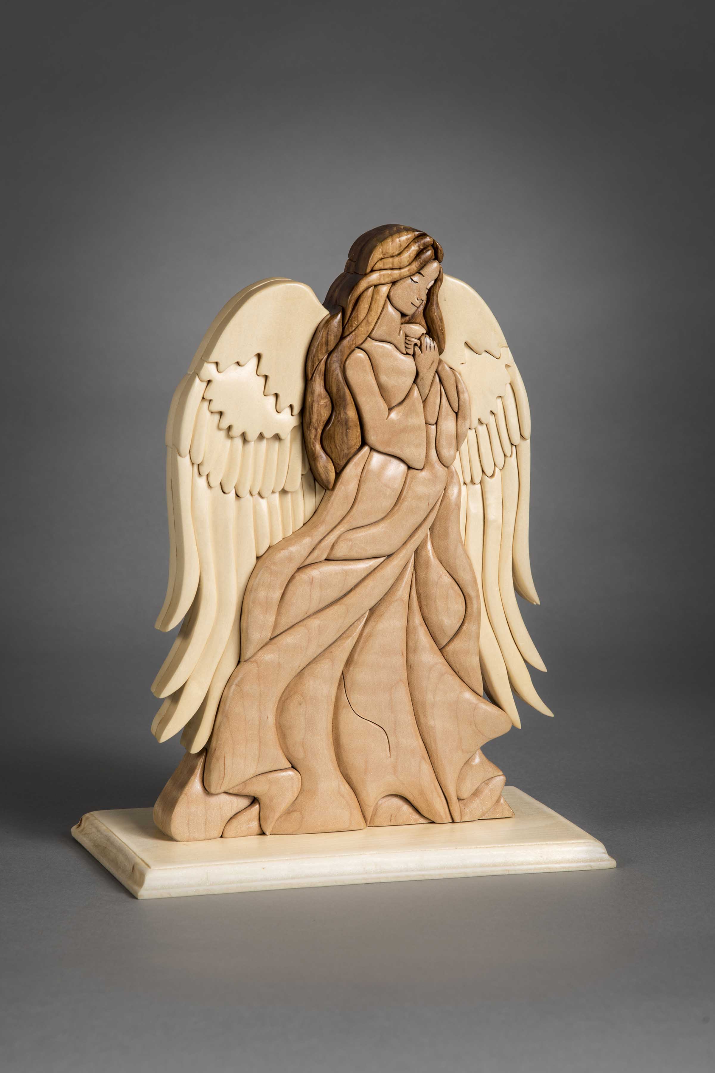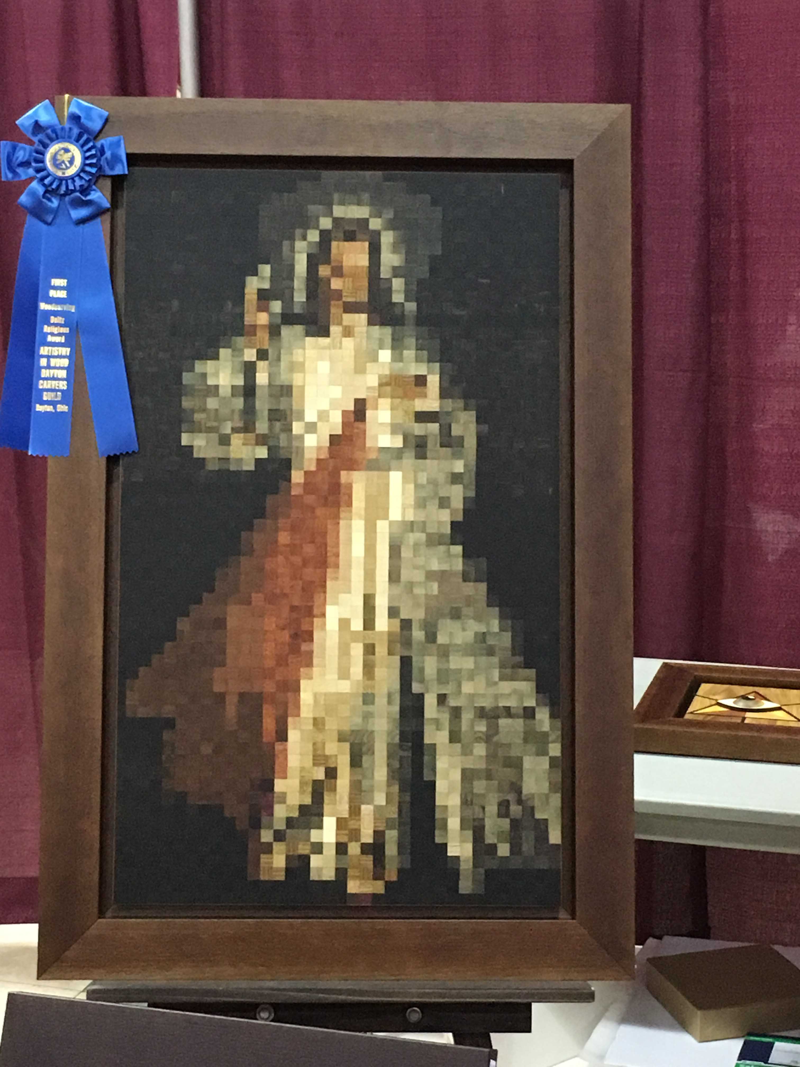 Scrollers were well represented in the show’s competition as well. Curt Blosser took home both First Place and Best of Scroll Saw Category for his chess set, made using a pattern by Dan Wilckens that appeared in Scroll Saw Woodworking & Crafts Fall 2017 (Issue 68). Bruce Shea won Second Best of Category with a red, white, and blue scrolled bowl. Erick Ortiz won the Deitz Religious Award for his cubist depiction of Jesus, as well as Third Best of Woodworking for his eagle head portrait. Vickie Schaub was a winner as well, taking a prize for her angel intarsia, made using a pattern by Kathy Wise that appeared in Scroll Saw Woodworking & Crafts Holiday 2015 (Issue 61).